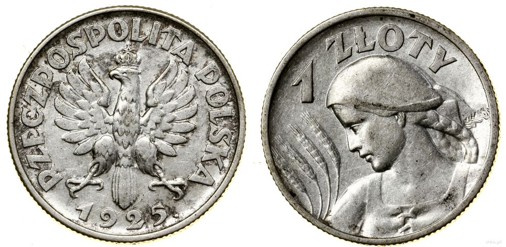 | Opis: | Polska - II Rzeczpospolita Polska (1918–1939) - monety obiegowe, 1 złoty, 1925, Londyn, popiersie kobiety z kłosami |