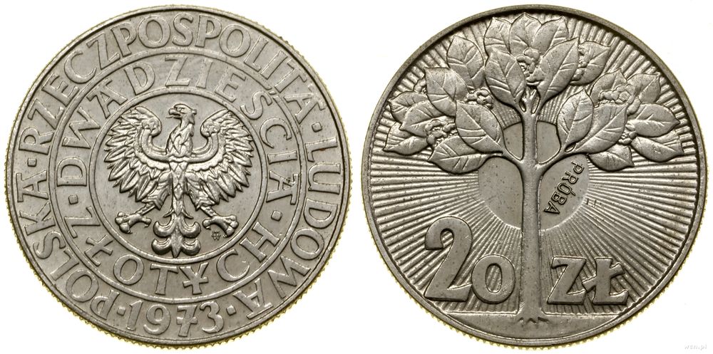 | Opis: | Polska - Polska Rzeczpospolita Ludowa (1952–1989) - monety próbne, 20 złotych, 1973, Warszawa, Drzewo, na rewersie wypukły napis PRÓBA |