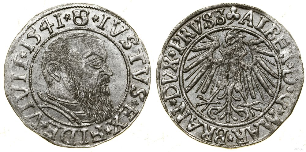 | Opis: | Prusy Książęce (1525–1657) - Albert Hohenzollern (1525–1568), grosz, 1541, Królewiec, odmiana z długą brodą księcia, końcówka legendy rewersu PRVSS |