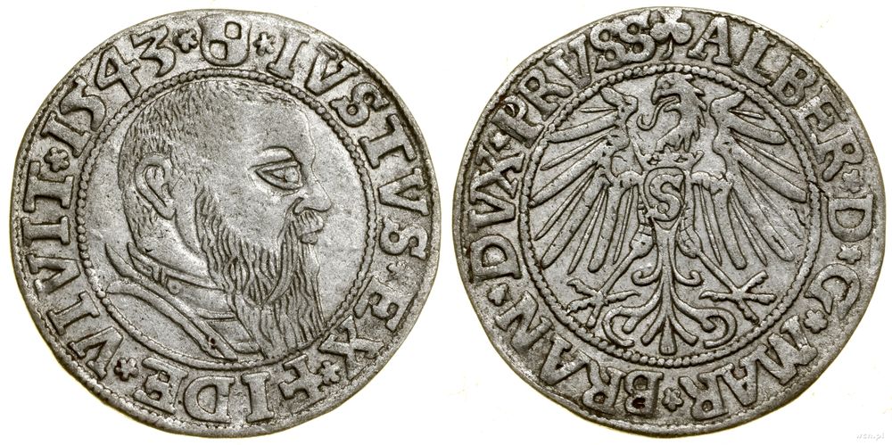 | Opis: | Prusy Książęce (1525–1657) - Albert Hohenzollern (1525–1568), grosz, 1543, Królewiec, końcówka legendy rewersu PRVSS |