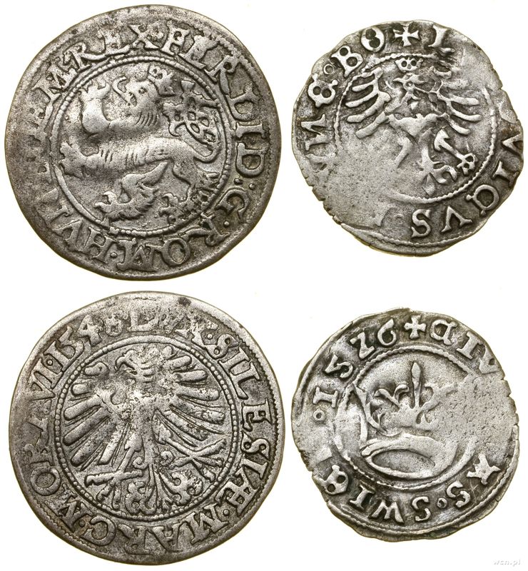 | Opis: | różne, zestaw 2 monet, 1) półgrosz miejski, 1526, Świdnica, Ludwik Jagiellończyk jako król Czech i Węgier (1516–1526) 2) grosz, 1548, Wrocław, Ferdynand I (1526–1564) |