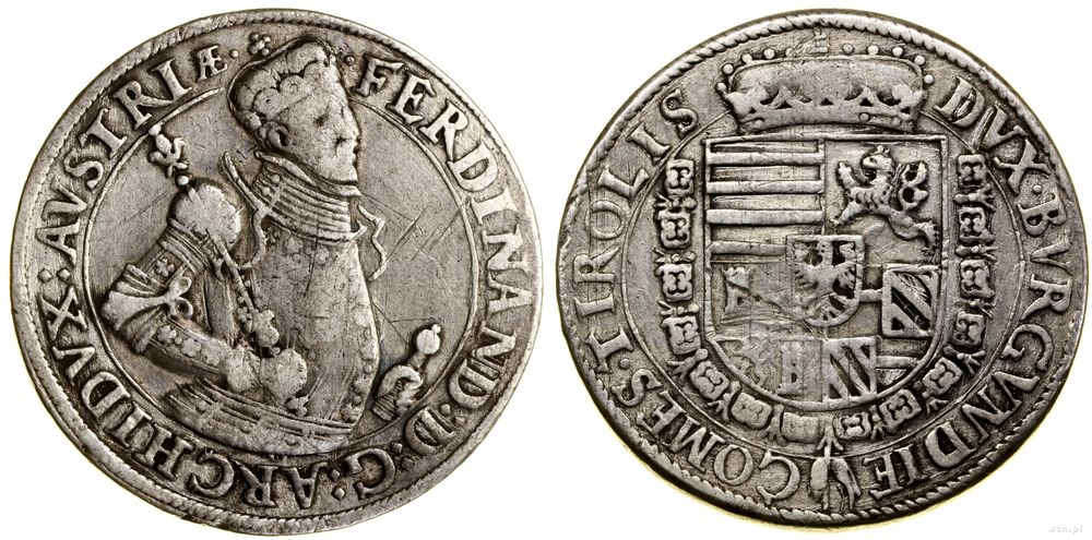 | Opis: | Austria - arcyksiążę Ferdynand II (1564–1595), talar, bez daty, Hall, Aw: Półpostać władcy, trzymającego berło i rękojeść miecza, w prawo, FERDINAND D G ARCHIDVX AVSTRIÆ, Rw: Ukoronowana, wielopolowa tarcza herbowa, otoczona łańcuchem z Orderem Złotego Runa, DVX BVRGVNDIAE COMES TIROLIS |