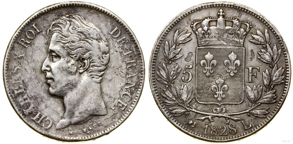 | Opis: | Francja - Karol X (1824–1830), 5 franków, 1828 L, Bayonne |