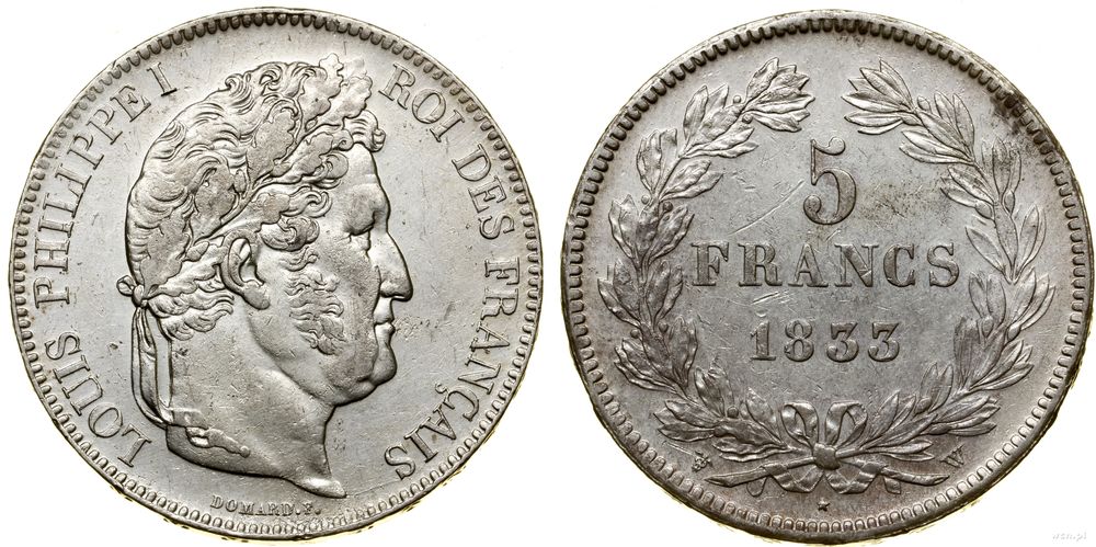 | Opis: | Francja - Ludwik Filip I (1830–1848), 5 franków, 1833 W, Lille |