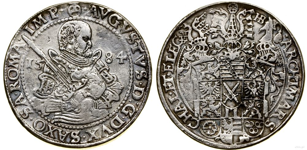 | Opis: | Niemcy - Saksonia - linia albertyńska (1547–1918) - August (1553–1586), talar, 1584 HB, Drezno, Aw: Półpostać władcy trzymającego miecz, w prawo, po bokach data, w otoku legenda, Rw: Wielopolowa tarcza herbowa, powyżej trzy hełmy z labrami i klejnotami, w otoku legenda |