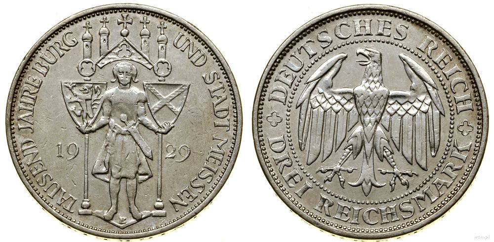 | Opis: | Niemcy - Republika Weimarska (1918–1933), 3 marki, 1929 E, Muldenhütten, 1000-lecie Miśni |