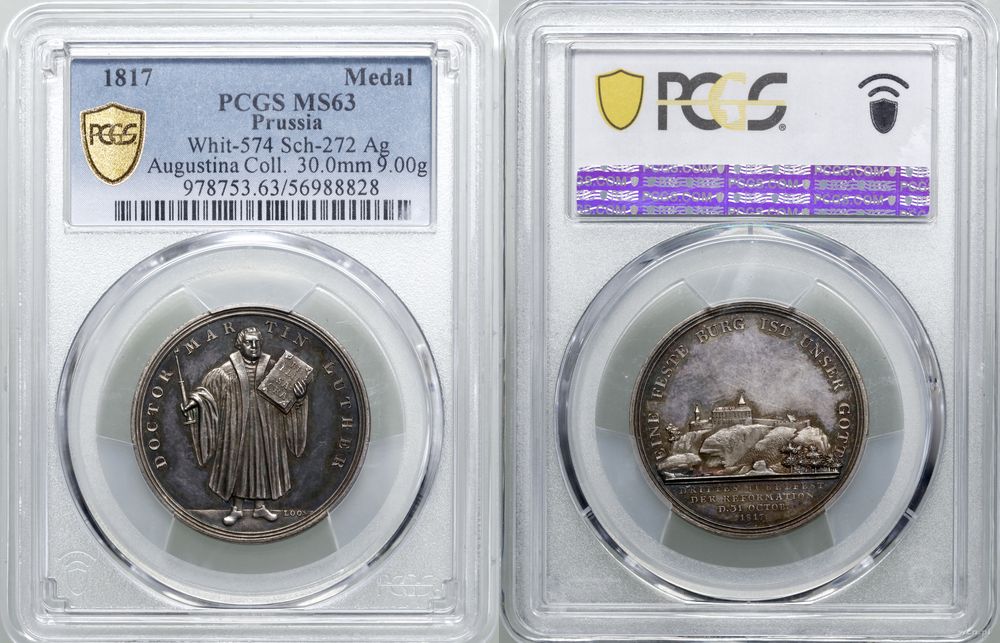 | Opis: | Niemcy - Prusy - Fryderyk Wilhelm III (1797–1840), medal, 1817, 300-lecie reformacji, sygnowany Loos; Aw: Marcin Luter stojący ze świecą i książką, DOCTOR MARTIN LUTHER; Rw: Zamek Wartburg w pobliżu miasta Eisenach, EINE FESTE BURG IST UNSER GOTT, w odcinku u dołu DRITTES IUBELFEST DER REFORMATION D 31 OCTOB 1817 |