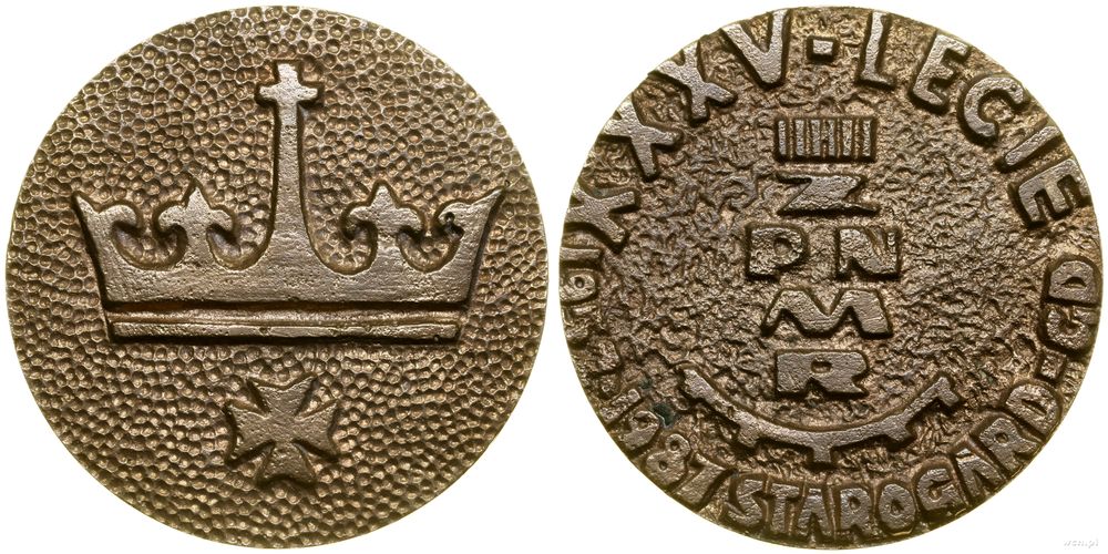 | Opis: | Polska - Polska Rzeczpospolita Ludowa (1952–1989), medal pamiątkowy, 1987, Aw: Korona, niżej krzyż, Rw: Z / PN / M / R, niżej fragment koła zębatego, XXXV-LECIE - 1952•1987 STAROGARD-GD |
