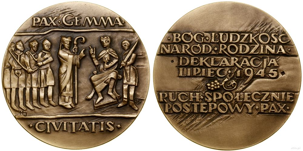 | Opis: | Polska - Polska Rzeczpospolita Ludowa (1952–1989), medal pamiątkowy, Częstochowa, Aw: Scena chrztu, wyżej PAX • GEMMA •, niżej • CIVITATIS •, Rw: • BÓG • LUDZKOSĆ • / NARÓD • RODZINA • / • DEKLARACJA / LIPIEC • 1945 • / RUCH • SPOŁECZNIE / POSTĘPOWY • PAX •, projektowała Hanna Jelonek, medal wybity w Zjednoczonych Zakładach Gospodarczych Veritas w Częstochowie |