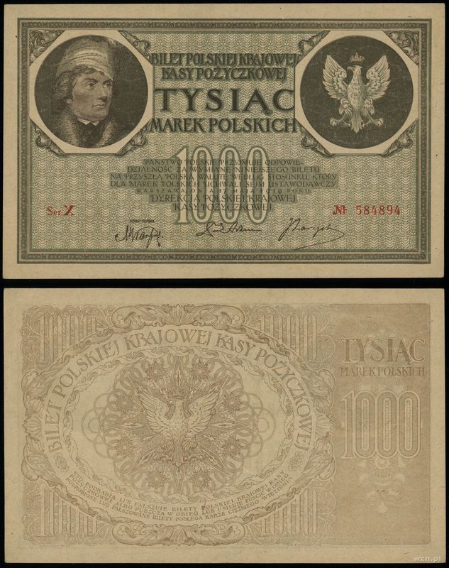 | Opis: | Polska - II Rzeczpospolita Polska (1918–1939) - emisje przed reformą Władysława Grabskiego, 1.000 marek polskich, 17.05.1919, seria X, numeracja 584894, znak wodny "plaster miodu" |