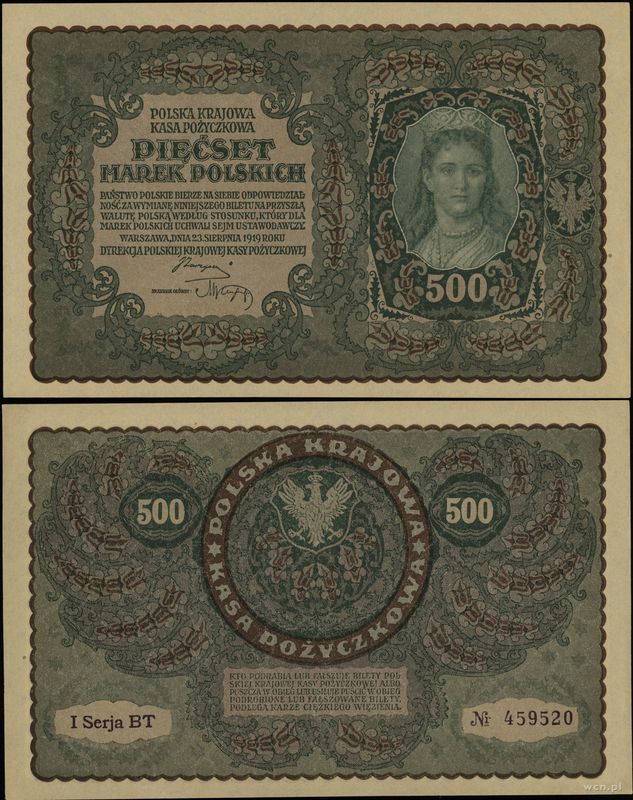 | Opis: | Polska - II Rzeczpospolita Polska (1918–1939) - emisje przed reformą Władysława Grabskiego, 500 marek polskich, 23.08.1919, seria I-BT, numeracja 459520 |