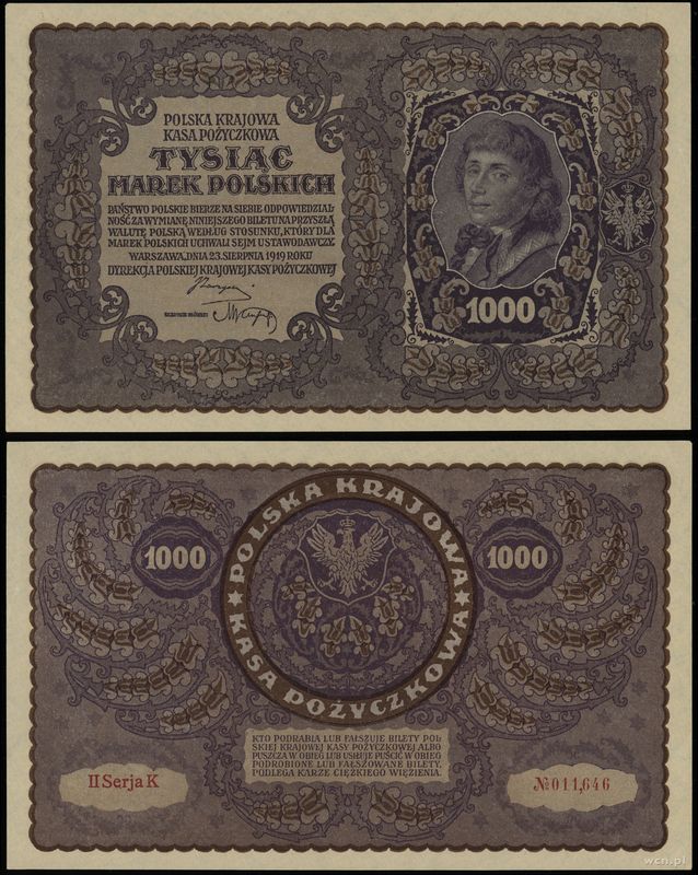 | Opis: | Polska - II Rzeczpospolita Polska (1918–1939) - emisje przed reformą Władysława Grabskiego, 1.000 marek polskich, 23.08.1919, seria II-K, numeracja 011646 |