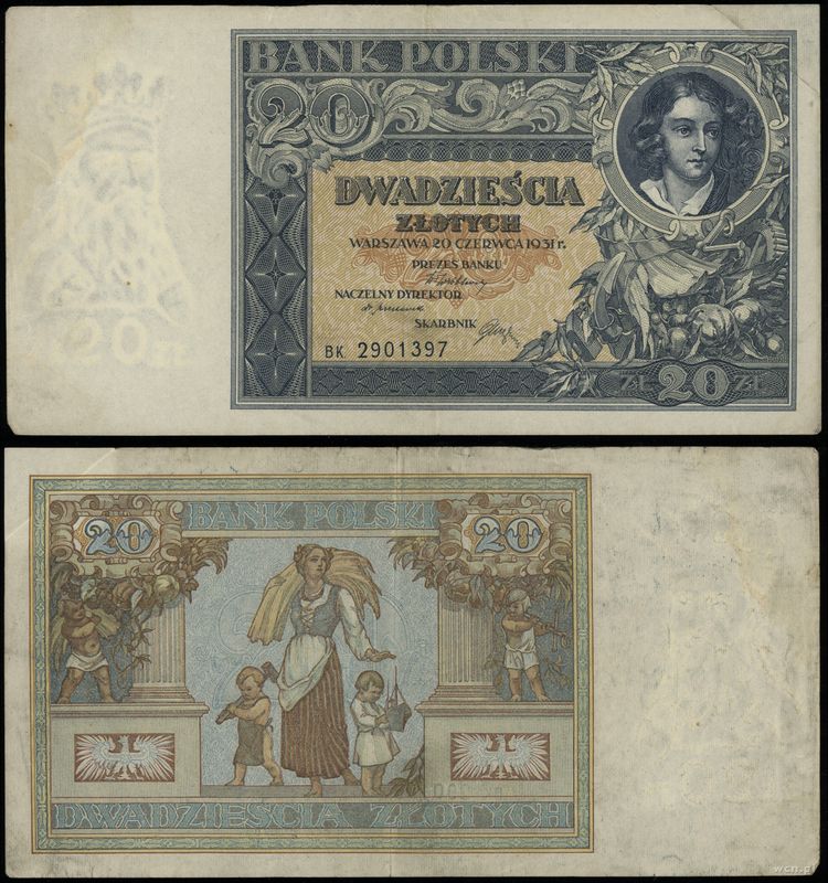 | Opis: | Polska - II Rzeczpospolita Polska (1918–1939) - emisje po reformie Władysława Grabskiego, 20 złotych, 20.06.1931, seria BK., numeracja 2901397 |
