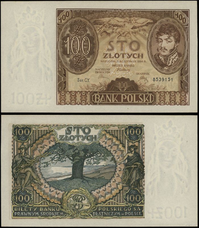 | Opis: | Polska - II Rzeczpospolita Polska (1918–1939) - emisje po reformie Władysława Grabskiego, 100 złotych, 9.11.1934, seria C.Y., numeracja 8539151 |