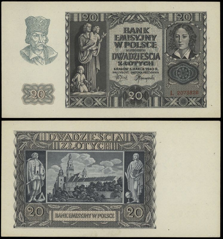 | Opis: | Polska - Generalna Gubernia (1939–1945) - Bank Emisyjny w Polsce, 20 złotych, 1.03.1940, seria L, numeracja 2073828 |