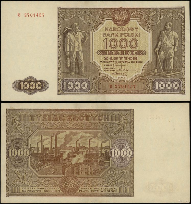 | Opis: | Polska - Polska powojenna (1944–1952), 1.000 złotych, 15.01.1946, seria E, numeracja 2701457 |