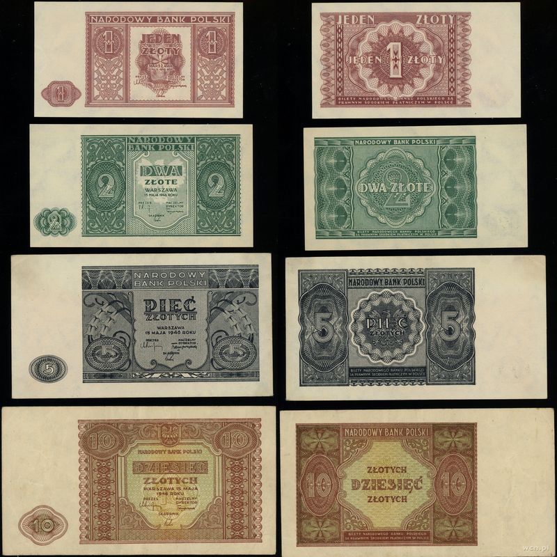 | Opis: | Polska - Polska powojenna (1944–1952), zestaw 4 banknotów, 15.05.1946, w zestawie: 1 złoty (II+), 2 złote (I/I-), 5 złotych (II+) i 10 złotych (stan III) |