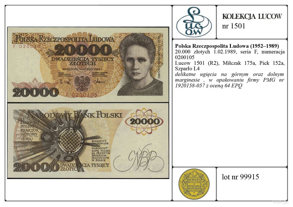 | Opis: | Polska - Polska Rzeczpospolita Ludowa (1952–1989), 20.000 złotych, 1.02.1989, seria F, numeracja 0200105 |