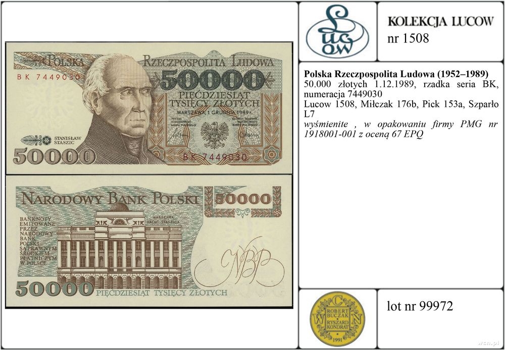 | Opis: | Polska - Polska Rzeczpospolita Ludowa (1952–1989), 50.000 złotych, 1.12.1989, rzadka seria BK, numeracja 7449030 |