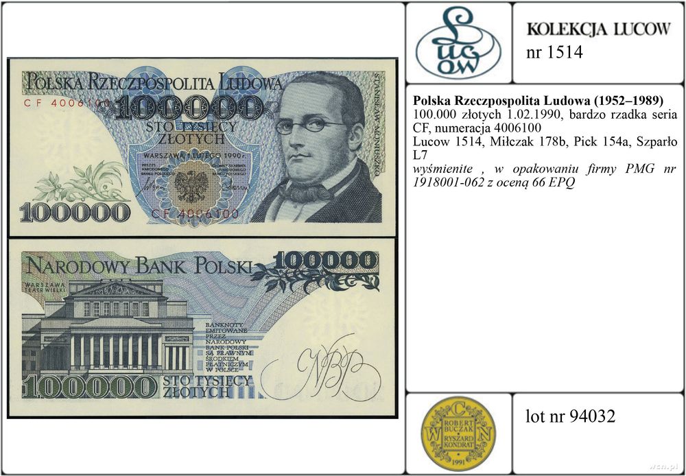 | Opis: | Polska - Polska Rzeczpospolita Ludowa (1952–1989), 100.000 złotych, 1.02.1990, bardzo rzadka seria CF, numeracja 4006100 |
