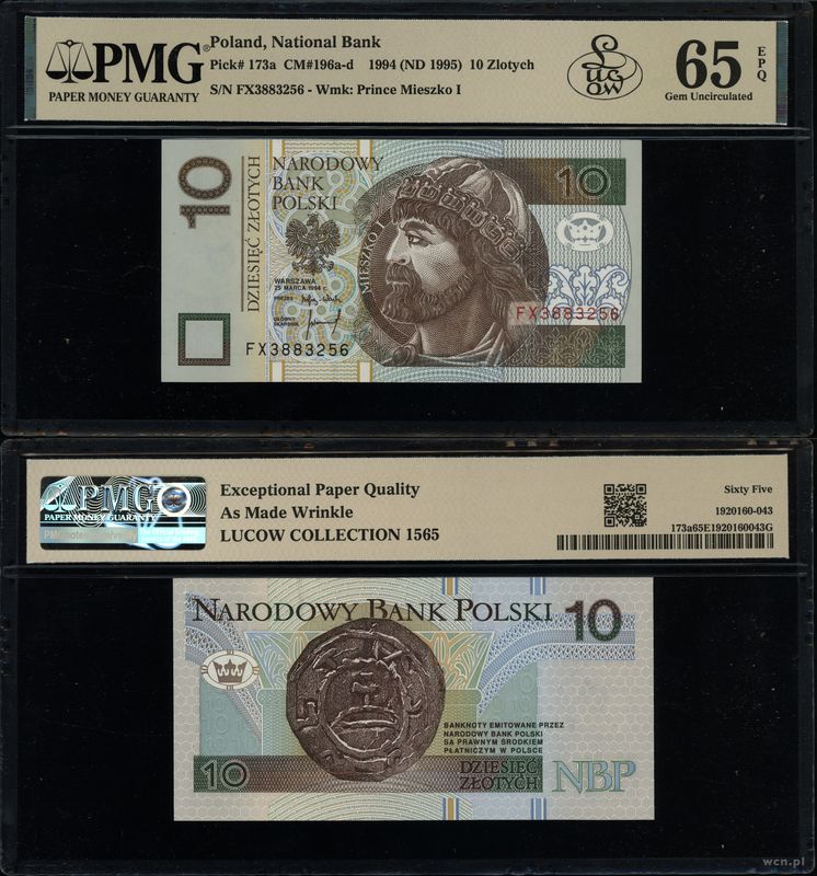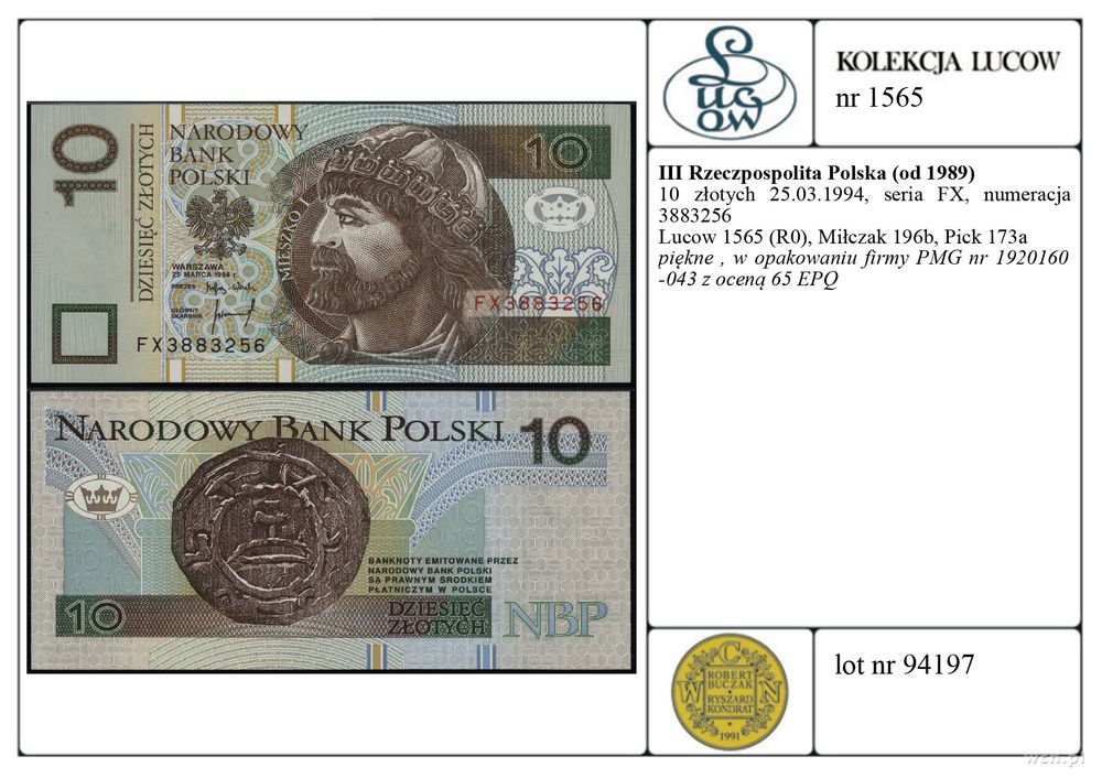 | Opis: | Polska - III Rzeczpospolita Polska (od 1989), 10 złotych, 25.03.1994, seria FX, numeracja 3883256 |