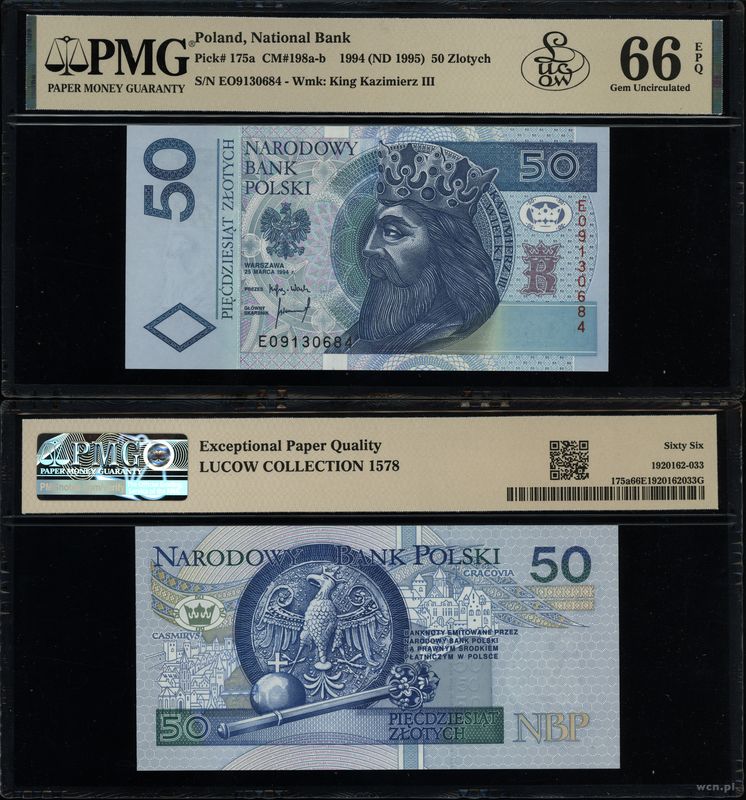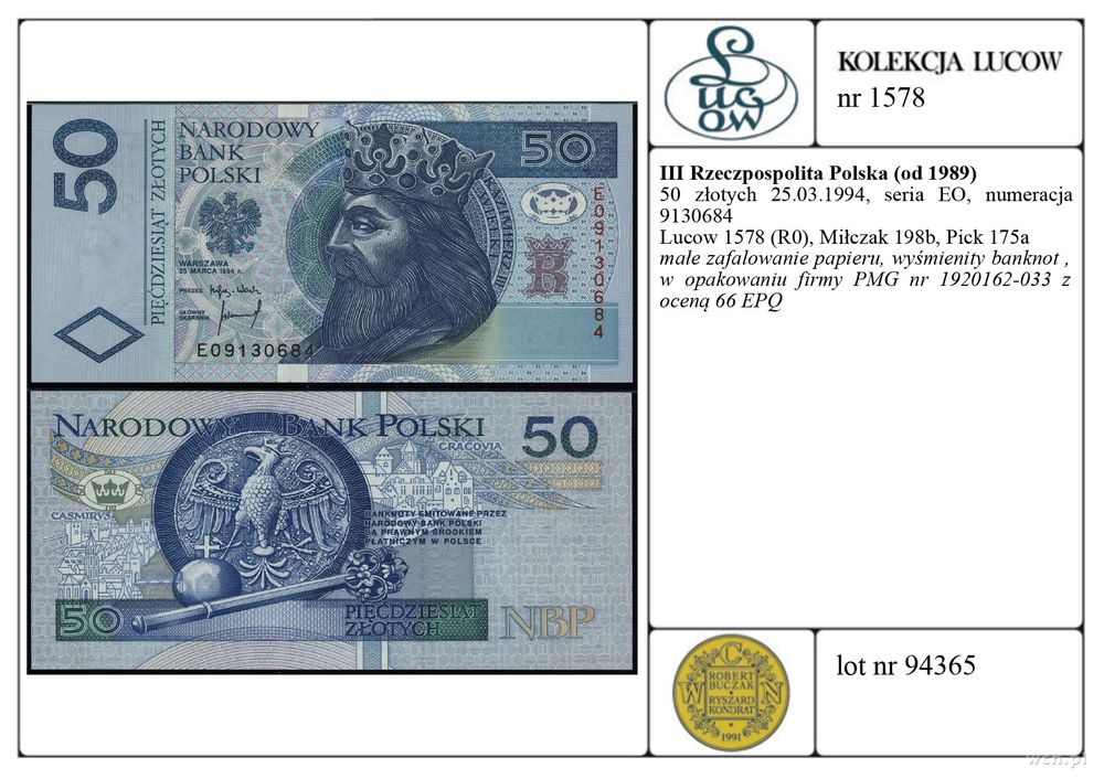 | Opis: | Polska - III Rzeczpospolita Polska (od 1989), 50 złotych, 25.03.1994, seria EO, numeracja 9130684 |