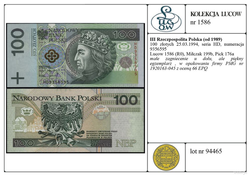 | Opis: | Polska - III Rzeczpospolita Polska (od 1989), 100 złotych, 25.03.1994, seria HD, numeracja 9356595 |