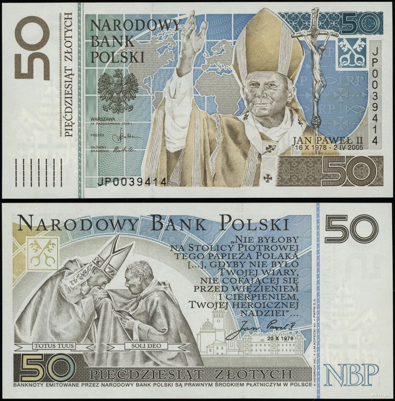 | Opis: | Polska - III Rzeczpospolita Polska (od 1989), 50 złotych, 16.10.2006, Jan Paweł II, seria JP, numeracja 0039414 |
