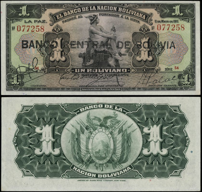 | Opis: | Boliwia - Banco Central de Bolivia, 1 boliviano, 11.05.1911, seria S4, numeracja 077258 |
