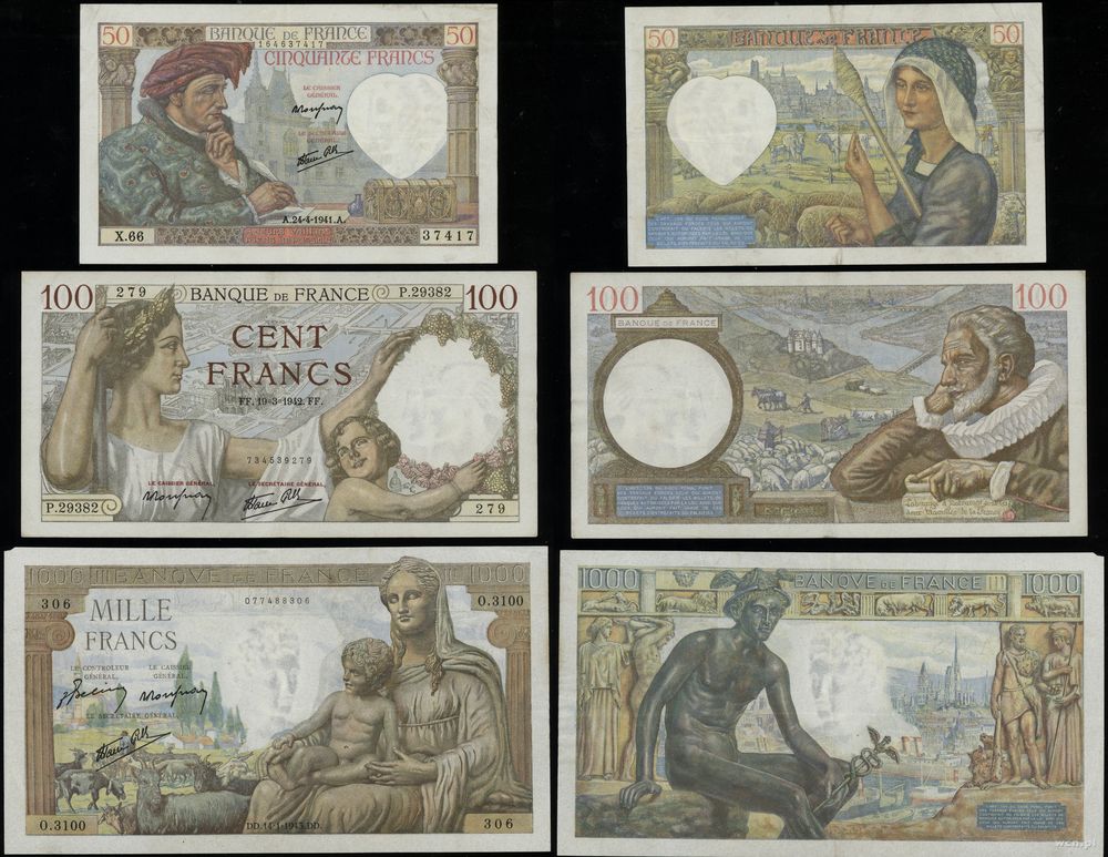 Francja, zestaw 3 banknotów, 1941–1943