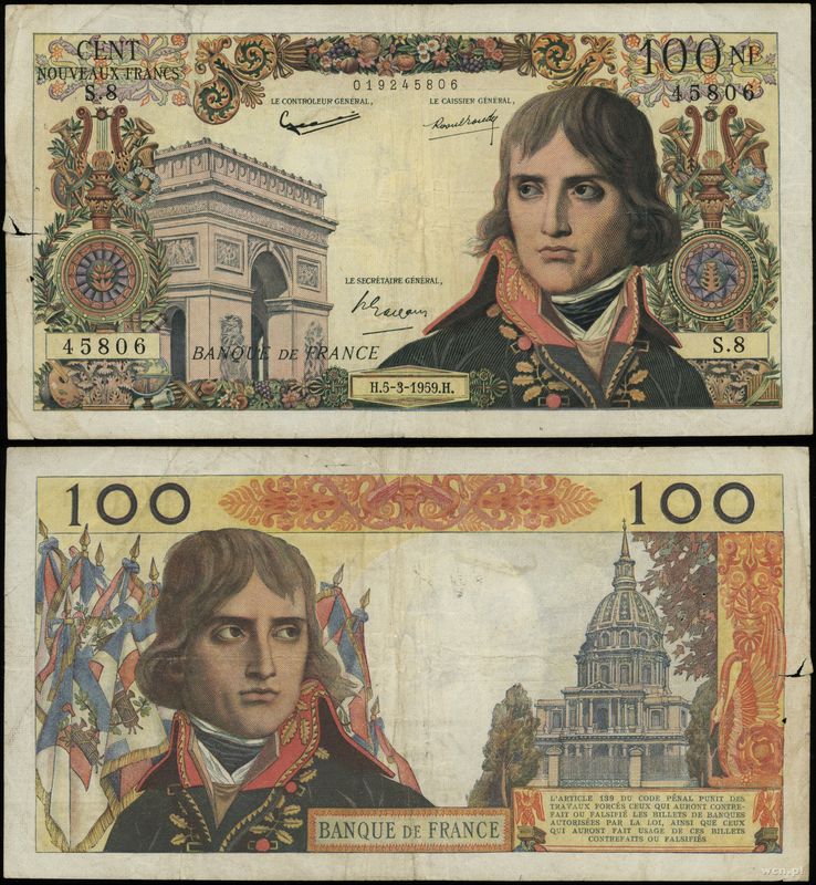 | Opis: | Francja - Banque de France, 100 nowych franków, 5.03.1959, typ Bonaparte, seria S8, numeracja 019245806 |