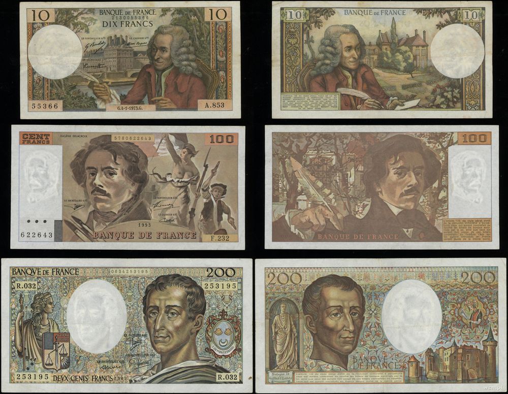 | Opis: | Francja - Banque de France, zestaw 3 banknotów, 1973–1993, 1) 10 franków 4.01.1973 seria A 853 (III) 2) 100 franków 1993 seria F 232 (II-) 3) 200 franków 1985 seria R 032 (III+) |