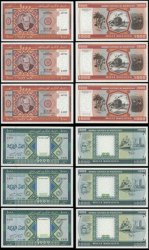 | Opis: | Mauretania - Banque Centrale De Mauritanie, zestaw 6 banknotów, 1981–1989, 1) 3 x 1.000 ouguiya 28.11.1981 serie G 009 2) 3 x 1.000 ouguiya 28.11.1989 serie Z 015 |