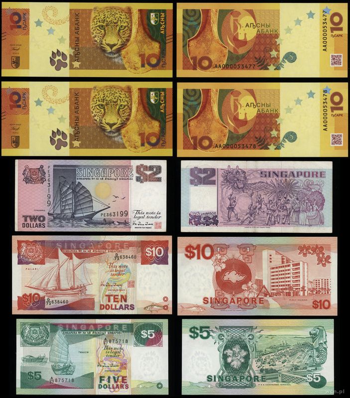 | Opis: | Singapur, zestaw 5 banknotów, w zestawie: 2 dolary 1997, 5 dolarów 1997, 10 dolarów 1988 (Singapur) - stany zachowania między II- a III+ oraz 2 x 10 apsar 2024 (Abchazja) - stany zachowania I |