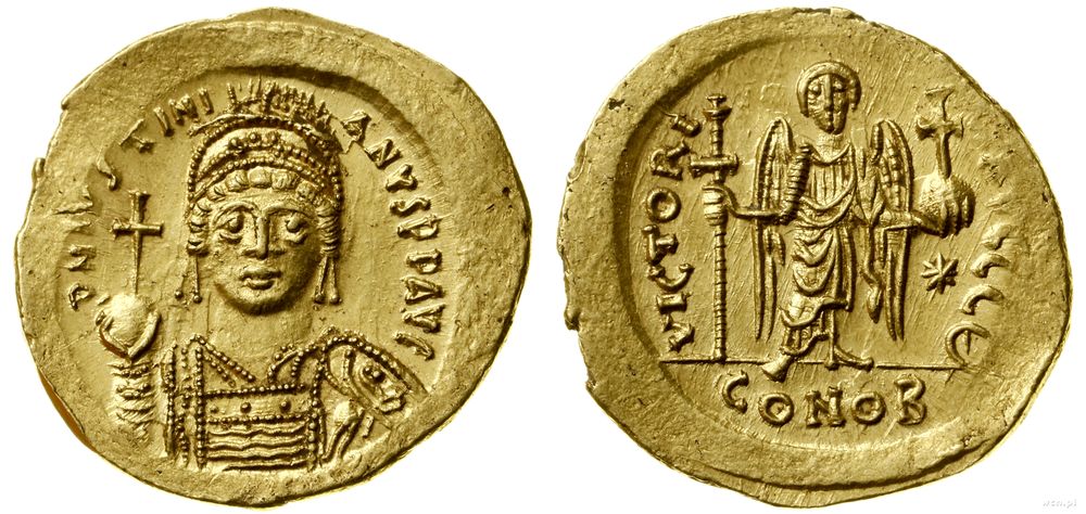 | Opis: | Bizancjum - Justynian I (527–565), solidus, (538–545), Konstantynopol, Aw: Popiersie cesarza na wprost, D N IVSTINIANVS P P AVG, Rw: Anioł stojący na wprost, trzymający długi krzyż i jabłko z krzyżem, VICTORIA AVCCC oficyna Θ, w odcinku CONOB |