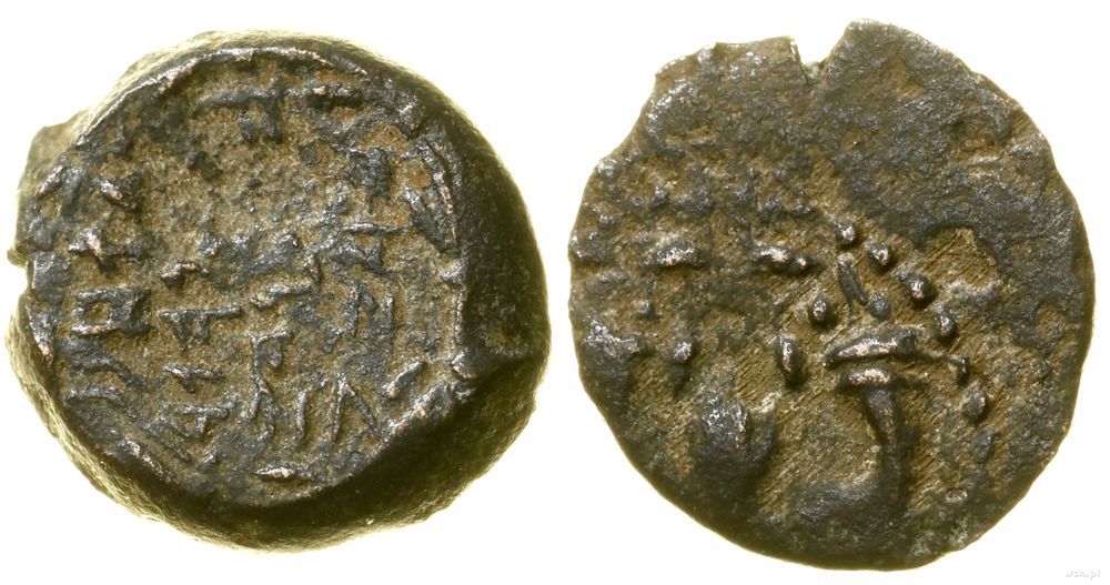 | Opis: | Rzym prowincjonalny - Judea - Dynastia Hasmonaean - Jan I Hyrkanos (135–104 pne), prutah, Jerozolima, Aw: Legenda w wieńcu, Rw: Dwa rogi obfitości, pomiędzy nimi owoc granatu |