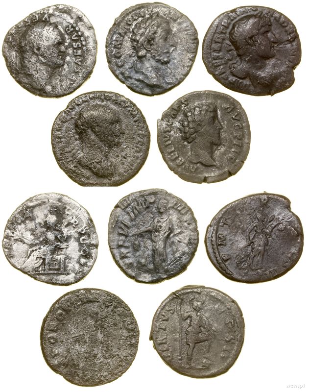 | Opis: | Cesarstwo Rzymskie - różni cesarze, zestaw 5 x denar, Rzym, Wespazjan / Marek Aureliusz (jako cezar) / Kommodus / Hadrian / Trajan (?) |