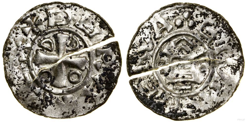 | Opis: | Niemcy - Saksonia - Otto III (983–1002), denar typu OAP (naśladownictwo?), Aw: Krzyż, w kątach O-D-D-O, + DGRA + REX, Rw: Kapliczka z poziomymi belkami, wewnątrz kulka, po bokach T - T, EIV–VA |