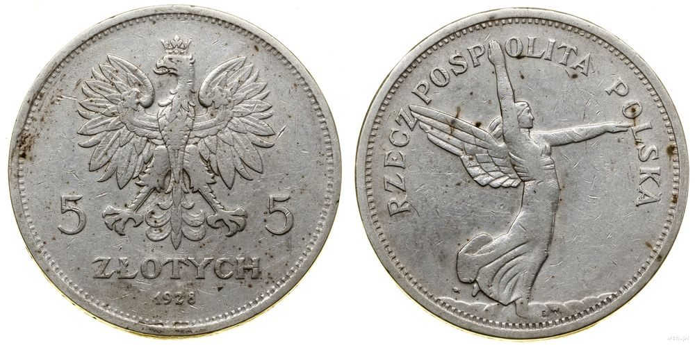| Opis: | Polska - II Rzeczpospolita Polska (1918–1939), 5 złotych, 1928, Warszawa, Nike, ze znakiem menniczym |