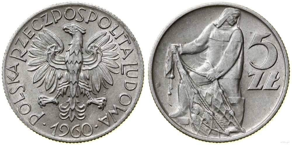 | Opis: | Polska - Polska Rzeczpospolita Ludowa (1952–1989) - monety obiegowe i kolekcjonerskie, 5 złotych, 1960, Warszawa, Rybak, odmiana ze tzw. słoneczkiem pod ramieniem rybaka |