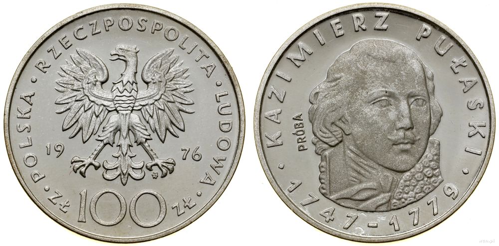 | Opis: | Polska - Polska Rzeczpospolita Ludowa (1952–1989) - monety próbne, 100 złotych, 1976, Warszawa, Kazimierz Pułaski (1747–1779) /głowa w prawo/, wypukły napis PRÓBA |
