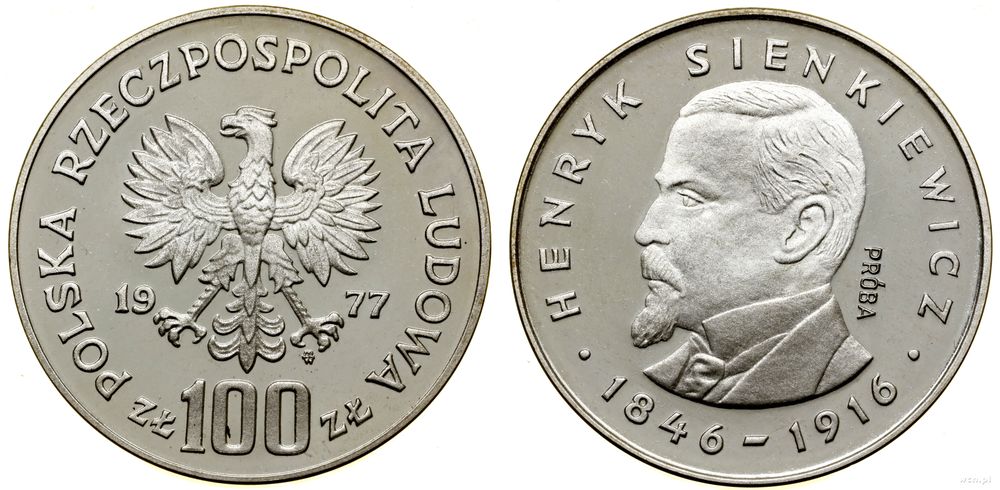 | Opis: | Polska - Polska Rzeczpospolita Ludowa (1952–1989) - monety próbne, 100 złotych, 1977, Warszawa, Henryk Sienkiewicz (napis w pełnym otoku), wypukły napis PRÓBA |
