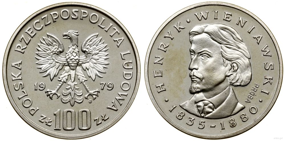 | Opis: | Polska - Polska Rzeczpospolita Ludowa (1952–1989) - monety próbne, 100 złotych, 1979, Warszawa, Henryk Wieniawski (napis w pełnym otoku), wypukły napis PRÓBA |