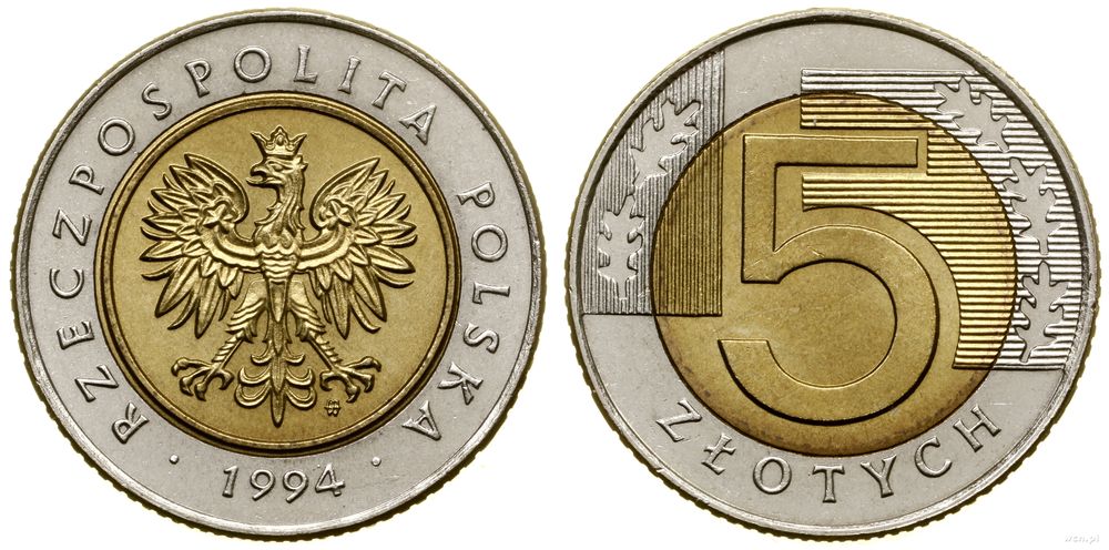 | Opis: | Polska - III Rzeczpospolita Polska (od 1989) - monety obiegowe, 5 złotych, 1994, Warszawa |