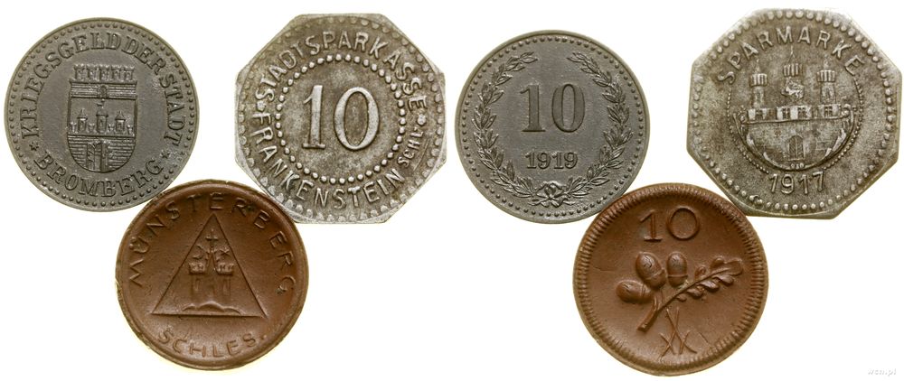 | Opis: | Polska, zestaw 3 monet, 10 fenigów, 1919, Bydgoszcz (cynk) (st. II+) / 10 fenigów bez daty, Ziębice (biskwit) (st. I-) / 10 fenigów 1917, Ząbkowice Śląskie (żelazo) (st. III) |