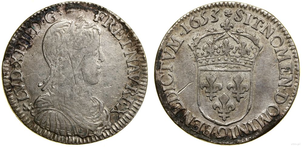| Opis: | Francja - Ludwik XIV Wielki (1643–1715), 1/2 ecu à la mèche longue, 1653 9, Rennes |