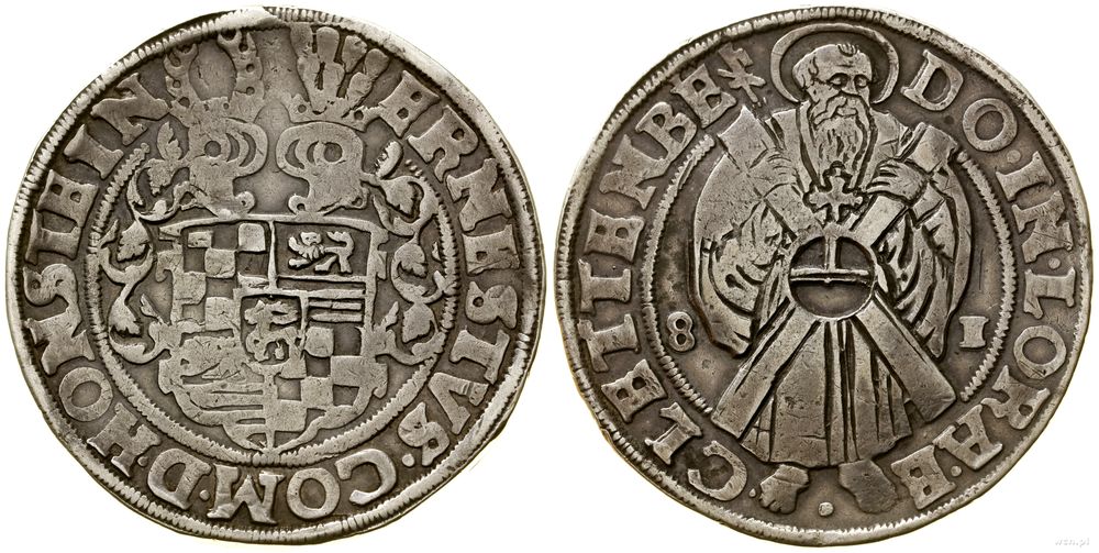 | Opis: | Niemcy - Hohnstein - Ernest VII (1580–1593), talar, 1581, Ellrich, mincerz Alex Sickel, Aw: Czteropolowa tarcza herbowa, powyzej dwa hełmy z labrami i klejnotami, ERNESTVS•COM•D•HONSTEIN, Rw: Święty Andrzej trzymający krzyż, DO IN LORA•E- •CLETTENBE |
