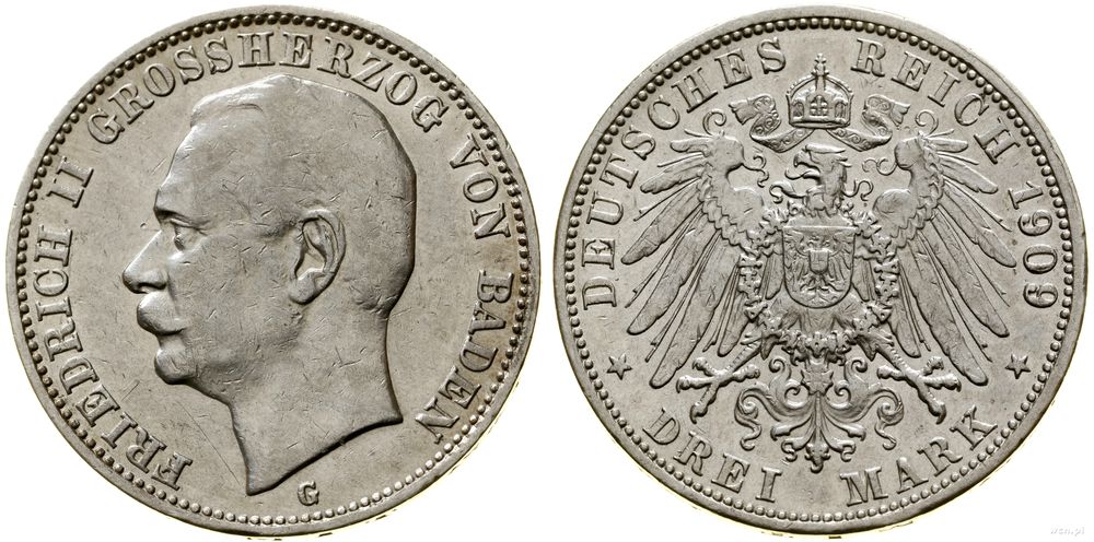 | Opis: | Niemcy - Badenia - Fryderyk II (1907–1918), 3 marki, 1909 G, Karlsruhe |