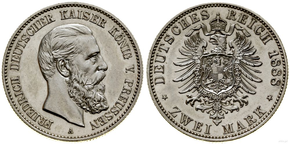 | Opis: | Niemcy - Prusy – królestwo (1701–1918) - Fryderyk III (1888), 2 marki, 1888 A, Berlin |