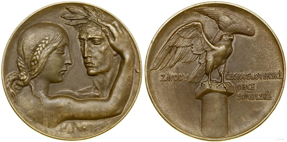 | Opis: | Czechosłowacja, medal nagrodowy, bez daty, Aw: Kobieta nakładająca mężczyźnie wieniec, na dole sygnatura HOREJC, Rw: Sokół stojący na kolumnie, po bokach ZÀVODY - ČESKOSLOVENSKÈ / OBCE / SOKOLSKÈ |